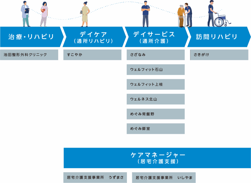 | 事業内容 | 医療・介護の提供 医療として整形外科・リハビリテーションクリニックを行っています。 介護は、居宅介護支援事業所・通所リハビリテーション・ 通所介護・訪問リハビリテーション施設など8施設(関連法人含む)を運営しています。 (令和6年6月より北山にて通所介護施設運営開始) |