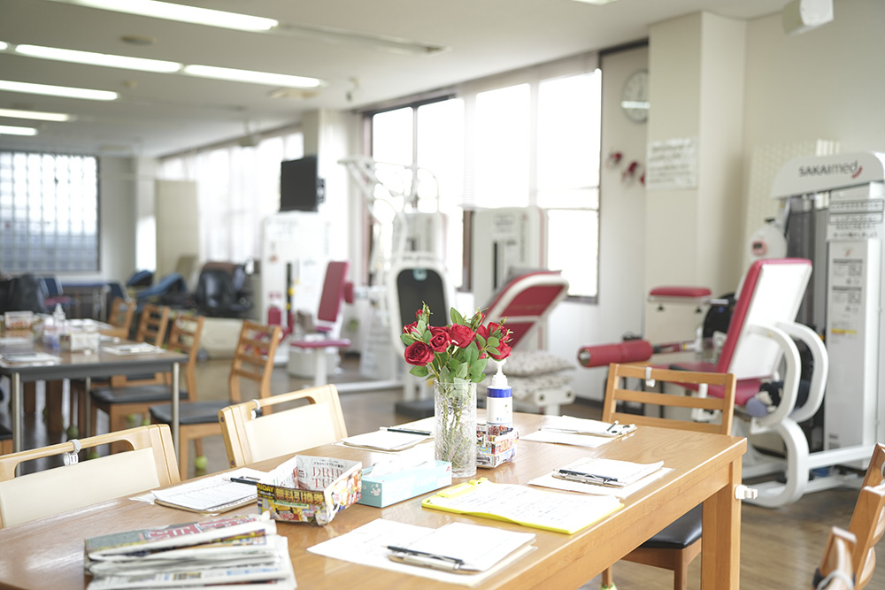 - 定員18名、半日型(入浴、食事なし)の2部制で、機能訓練指導員による利用者様に合わせた 個別機能訓練と、8種類のマシン運動を提供しています。
